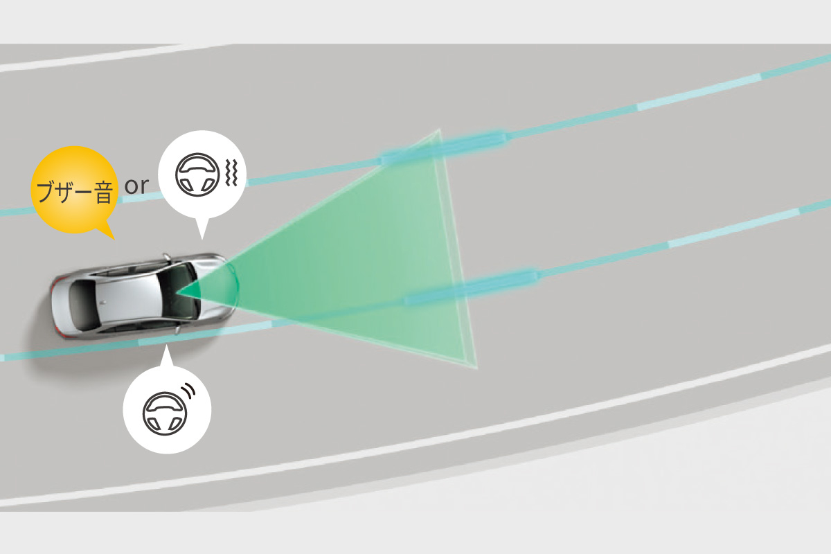 ブラインドスポットモニター[BSM]の後側方ミリ波レーダーで自車後方の車両を検知し、後方車両が接近した場合には、マルチインフォメーションディスプレイ表示や、ブザーにてお知らせ。インナーミラーへ視線誘導し、後方車両の回避要否の判断をアシストします。